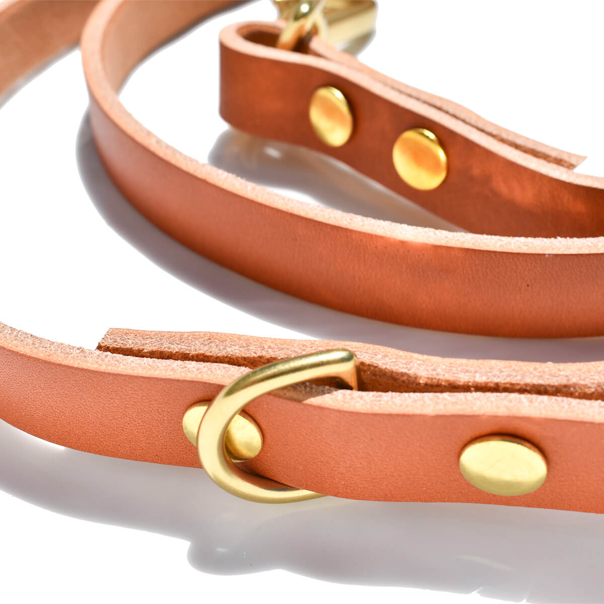 Warm caramel vegetable-tanned leather, brass hardware. A foundational leather dog leash that only gets better.
