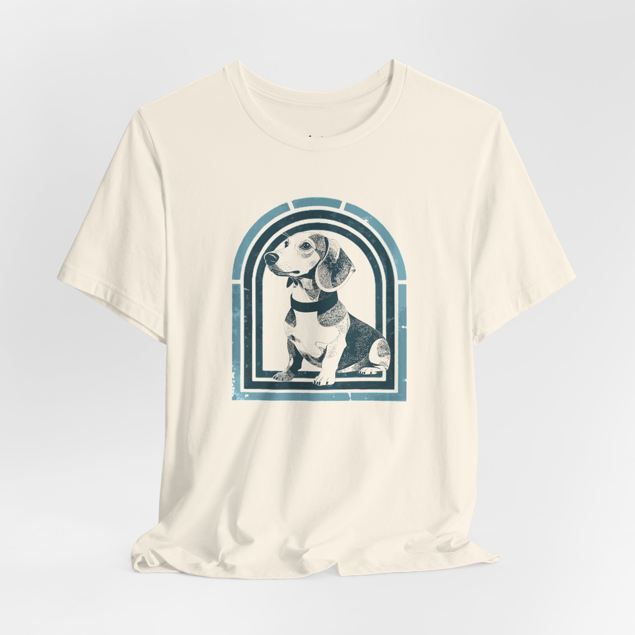 Soft, breathable cotton meets quiet, nostalgic charm. Dog in the Window Tee is a lightweight crew tee features a vintage-style portrait of your favorite pup framed within layered arch lines — washed blues and muted tones for an easy, lived-in look.