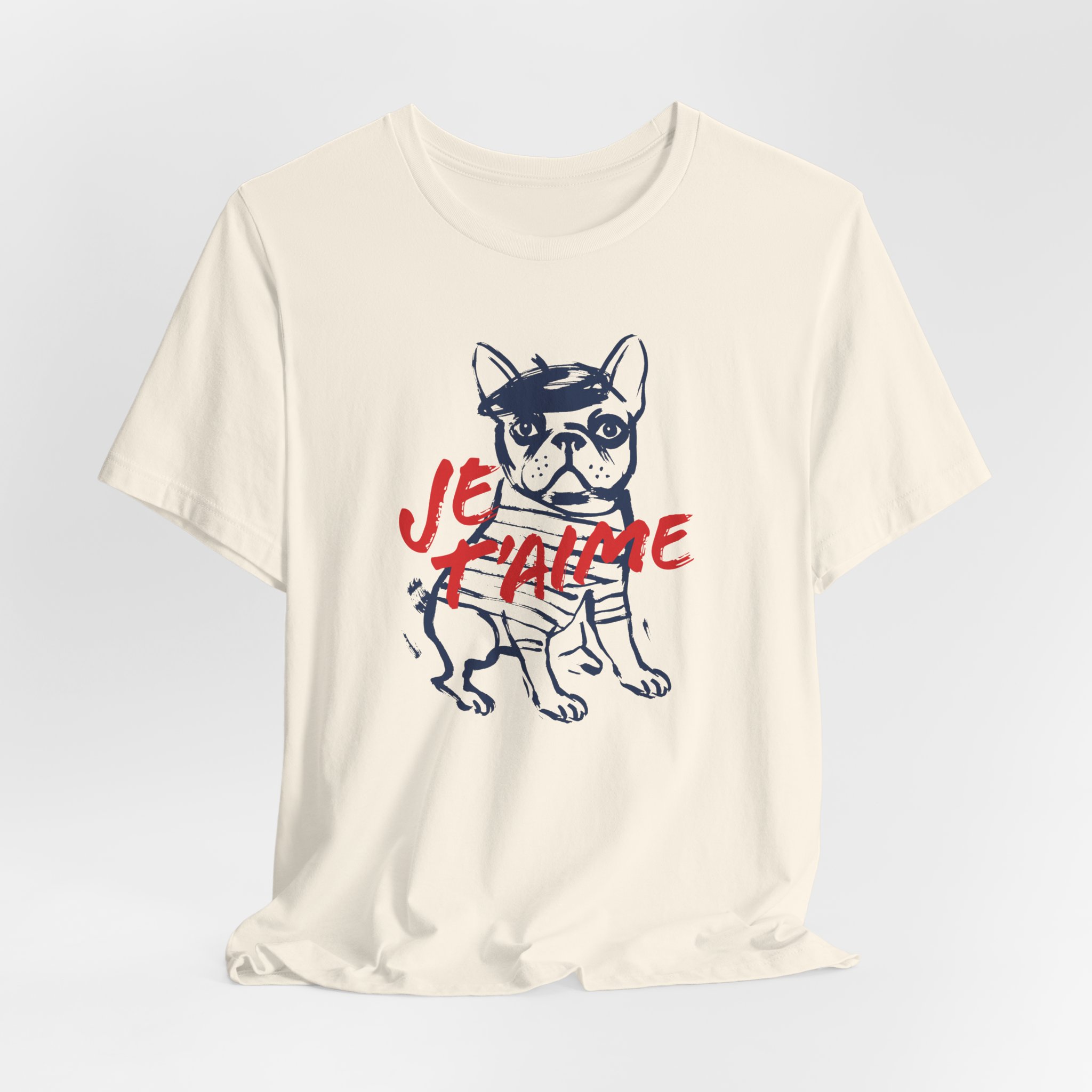 A lightweight, everyday tee that reads like a small love note to city dogs and their humans. Hand-drawn in navy on natural cream, this Frenchie comes dressed for the occasion — beret, Breton stripes, and a quiet confidence that needs no introduction. Je t’aime says the rest.