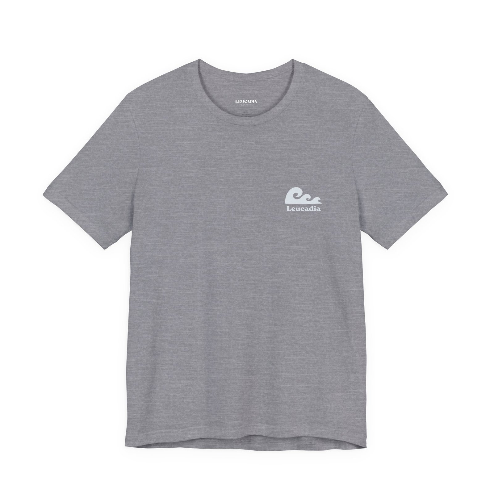 Heathered fabric has a slightly softer, more lived-in feel than solid cotton from the first wear. The wave graphic sits on the chest — small, specific, not trying too hard. Relaxed unisex fit, ribbed crew collar.