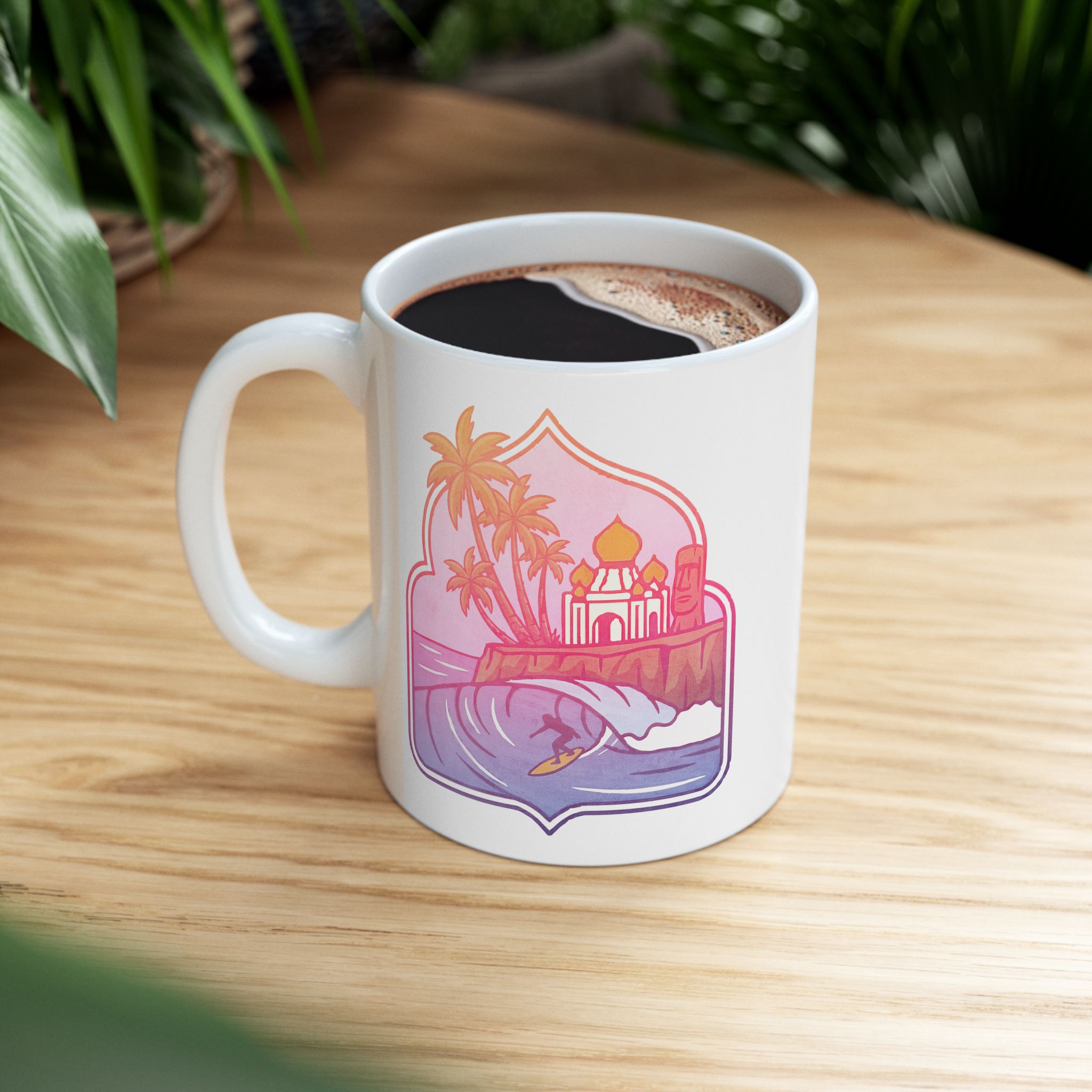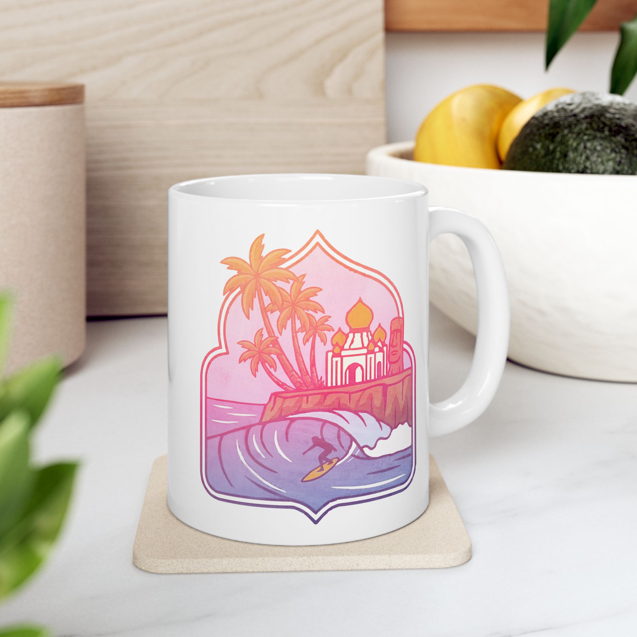 A wrap-around coastal illustration of the Swami’s shoreline — palm silhouettes, rolling surf, a California sunset — on a glossy white ceramic mug. 11 oz. Comfortable handle. Dishwasher safe, microwave safe, holds up wash after wash.
