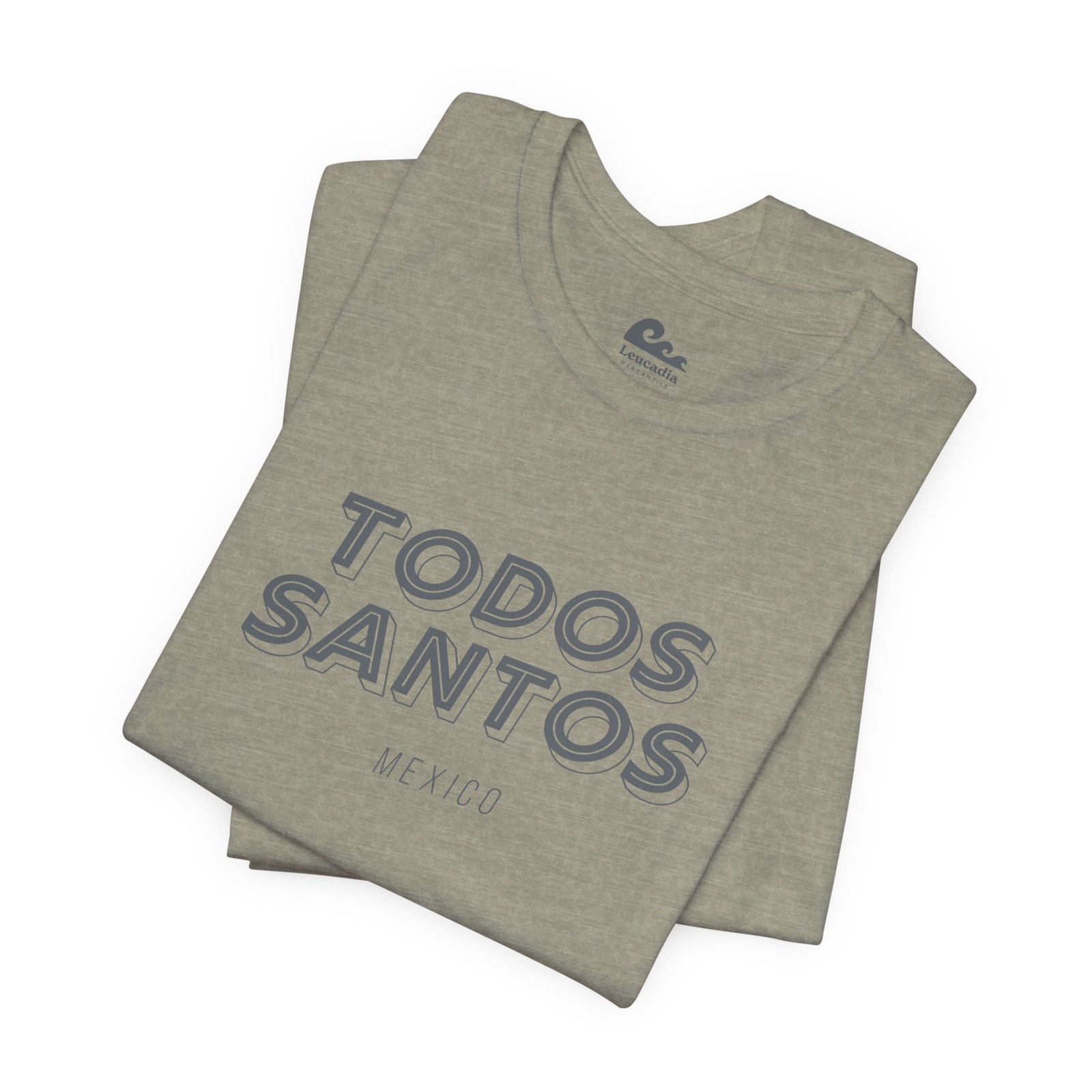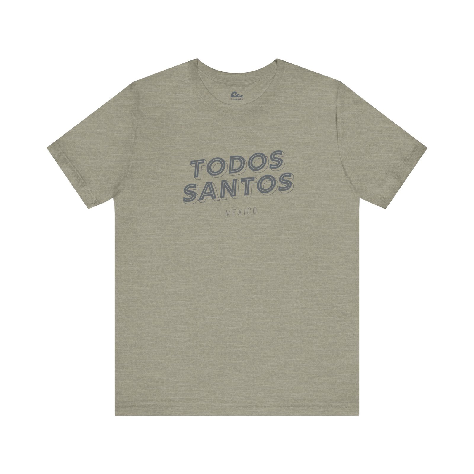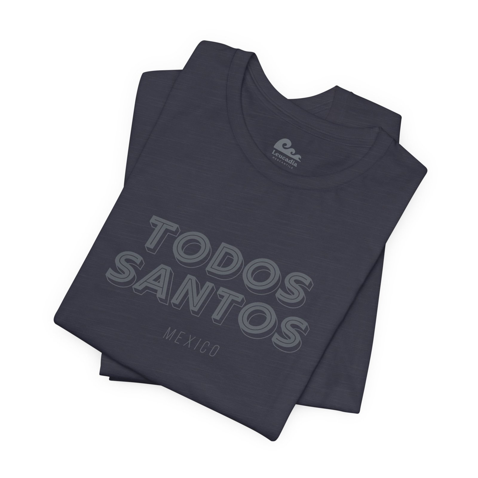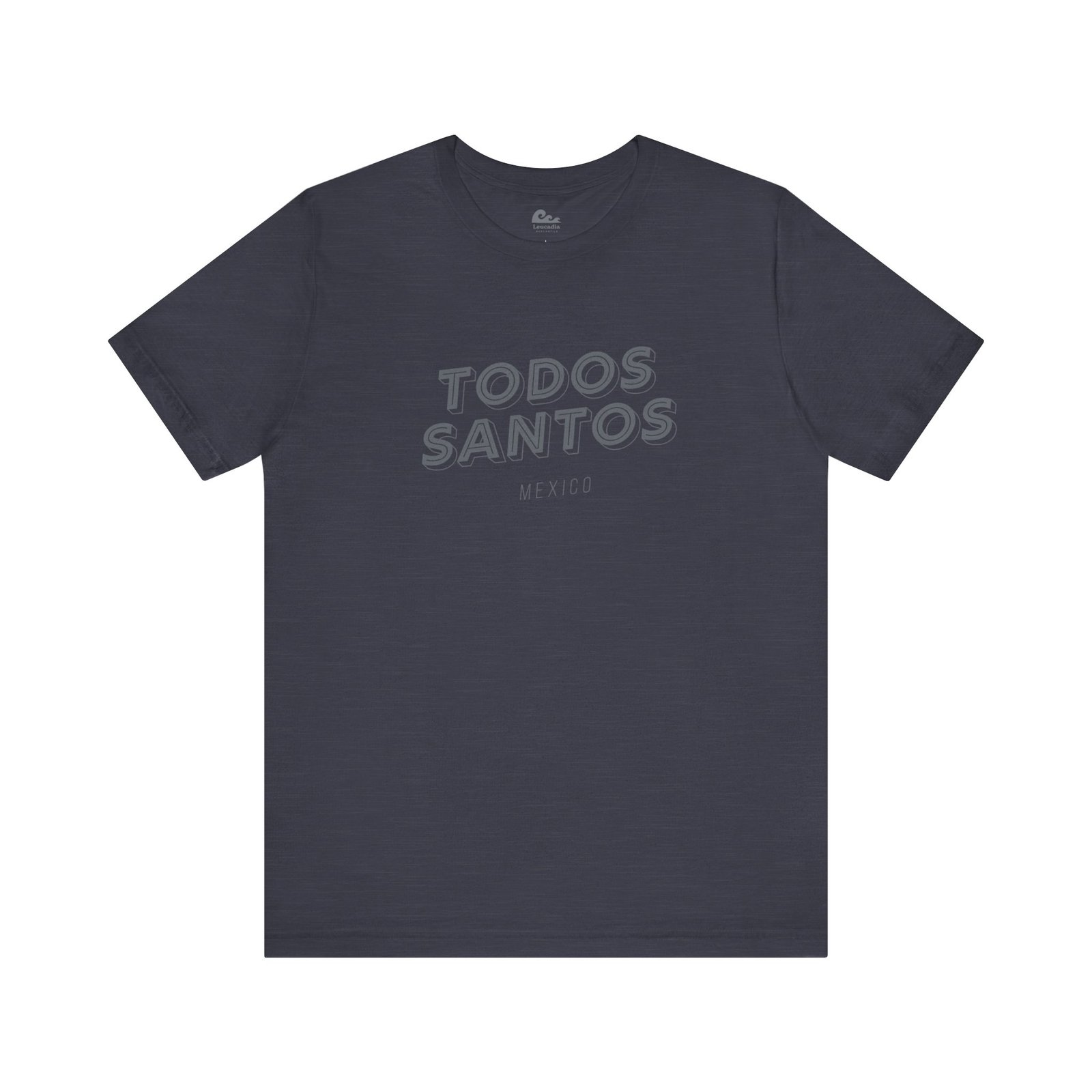 The Todos Santos tee carries the name in bold dimensional type on a Bella+Canvas tee. MEXICO in small spaced caps beneath it. Lightweight, relaxed, the exact shirt for the drive back up the peninsula. Part of the Leucadia Mercantile place name collection — California, Baja, and beyond.
